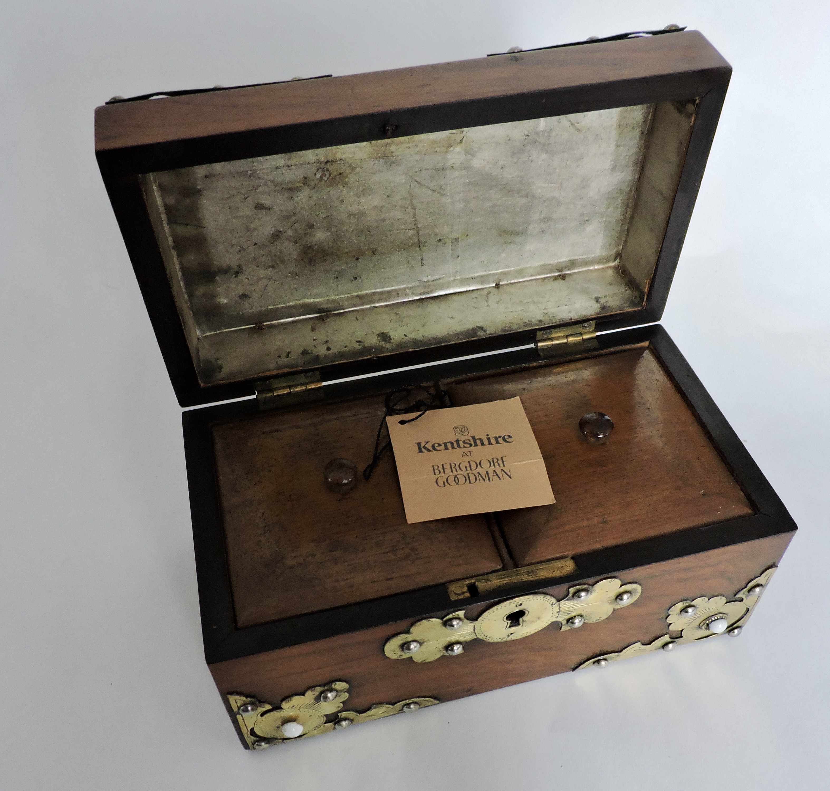 A lovely Victorian rosewood and brass decorated tea caddy, circa 1840. Formerly sold through Bergdorf Goodman, NYC.